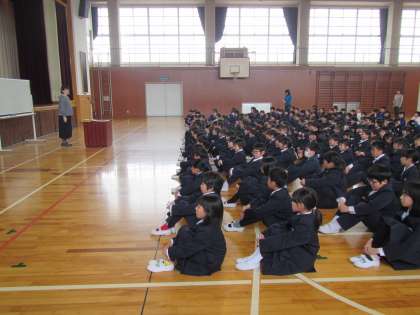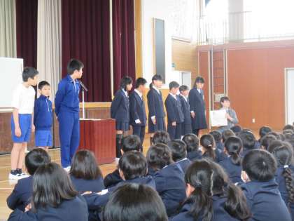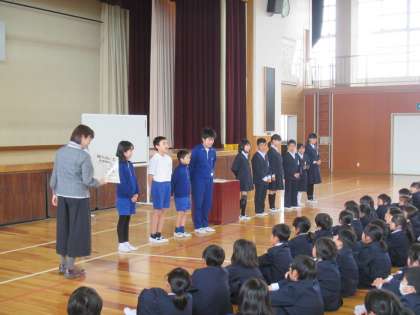 昨年度、みんなでがんばった「暗記にちょうせん!」の姿を1年生に披露。