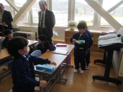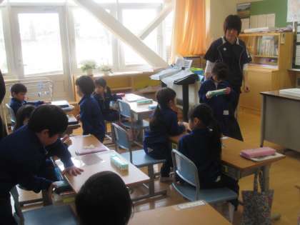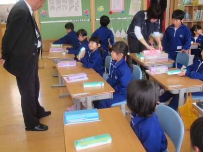 算数セットの準備をしている1年生。