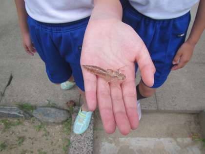 「校長先生、ほら、ヤゴの抜け殻だよ。」