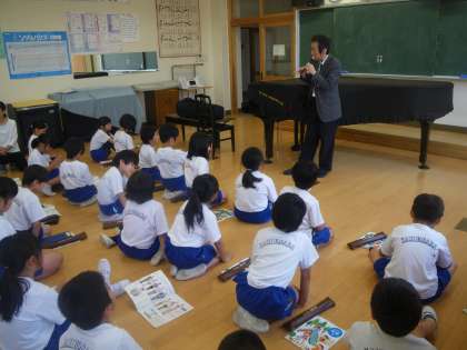 本日は、3年生のリコーダー講習会が行われました。子ども達が持っているソプラノリコーダーをはじめ、様々な大きさのリコーダーを見せていただき、演奏してもらい、その音の美しさと奏法に感動していました。「自分たちもこんな演奏をしてみたい!近づきたい!」という意欲が高まりました。