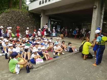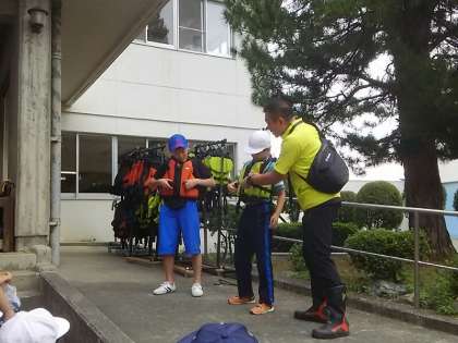 間もなくカヌー体験です。ライフジャケットの着方を習っています。