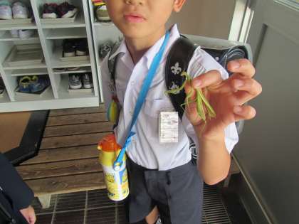 「校長先生、オオカマキリが学校見学に来ています。」