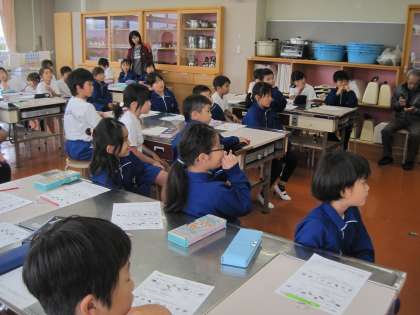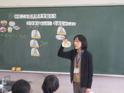 給食センターの佐藤香代子先生をお呼びして,食育授業「かむことの大切さ」を行いました。よくかむことは,「肥満を防ぐこと」「おなかによいこと」「頭がよくなること」「歯の病気を防ぐこと」など,体の発達によい影響を及ぼすことを教えていただきました。実際にするめを食べ,よく噛むことの大切さを実感することができました。
