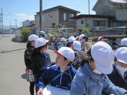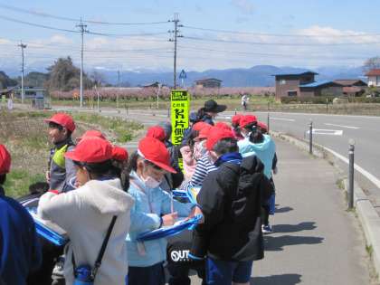 強風の中、3年生は中組方面の町たんけんに行ってきました。桃の花がとても美しくさいていました。