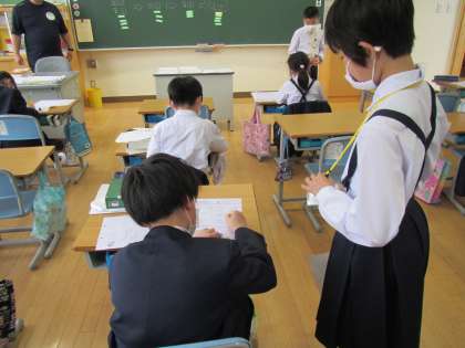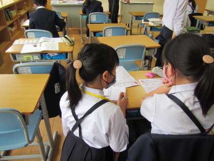同じ向きで、声を出さずにノートを活用して、教え合い。