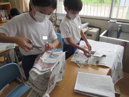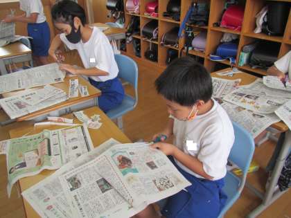 新聞の見出しを切り抜く4年生。