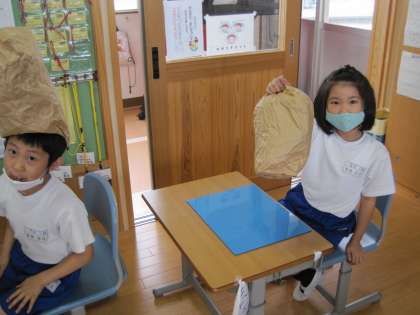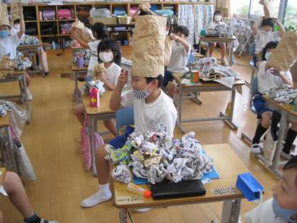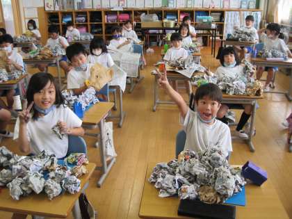 新聞紙のごみ?いえいえ,ひとつひとつ,クッション材のようにしわしわに丸めて,紙袋に詰めて。かわいいクッションのような作品ができあがりました。