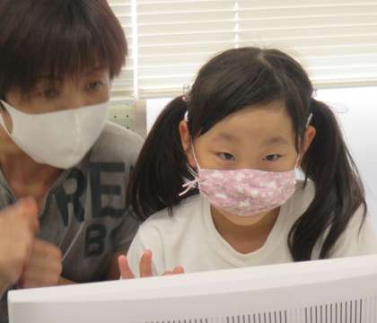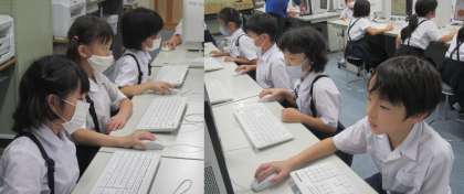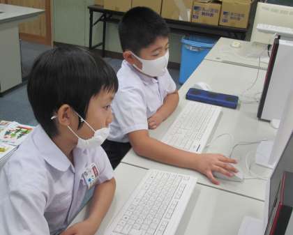 パソコンを使って、生活科ファイルの表紙を作成中。