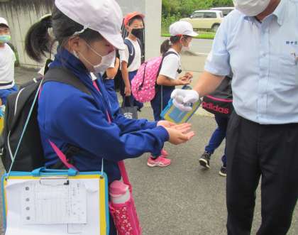 手指消毒を行ってバスに乗車。
