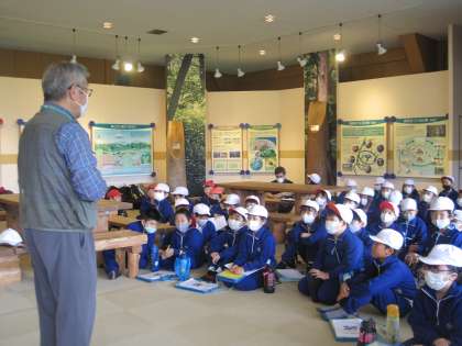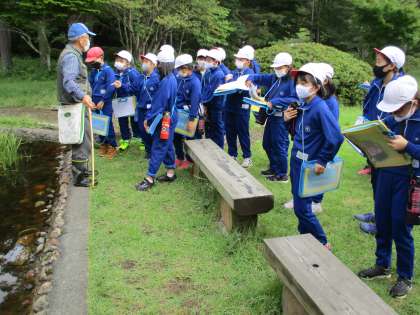 9月11日の森林体験学習の様子。森の案内人の方から水辺の生き物や樹木の話を真剣な表情で聞く子どもたちです。