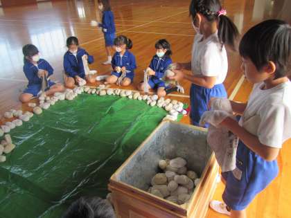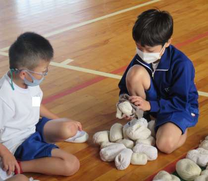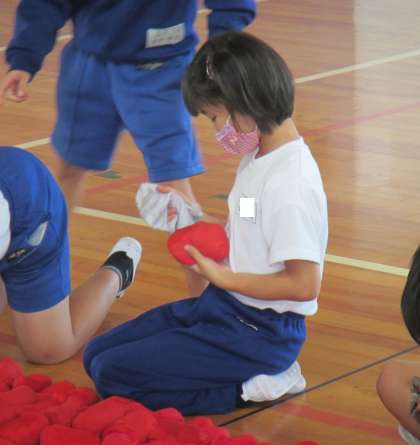 2年生が、玉入れで使った紅白玉の後始末。