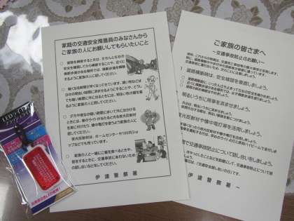 先日、伊達警察署長さんより、交通事故防止に向けたちらしと夜光反射板をお預かりしました。