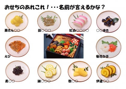 先日、廊下に掲示した「おせちクイズ」について、通りがかった1年生に声をかけました。