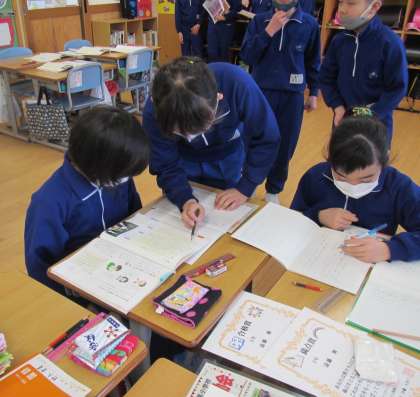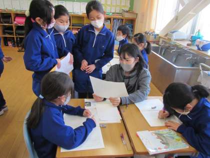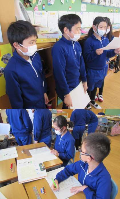 学校の自慢を発表する準備。