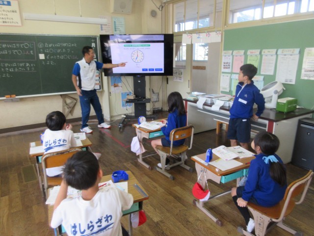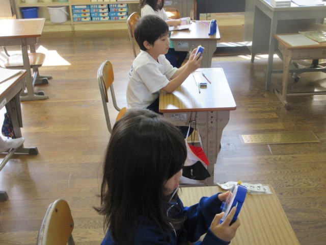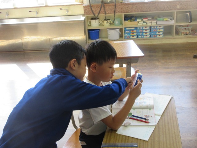 1年生は、算数セットの時計を使いながら、時間の読み方を学習していました。2年生も時々アドバイスをしてくれています。