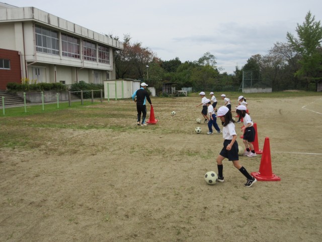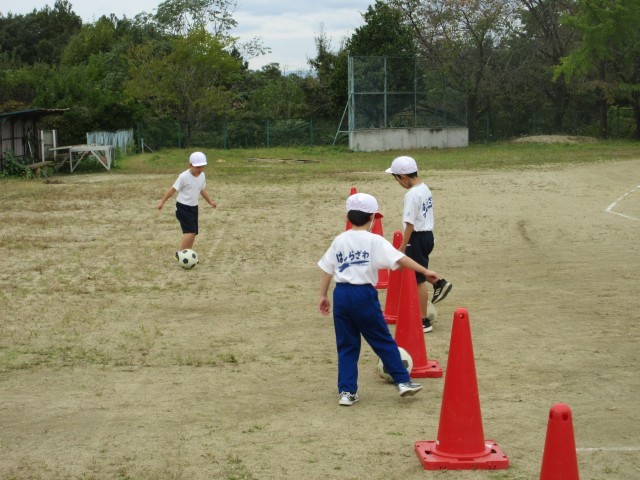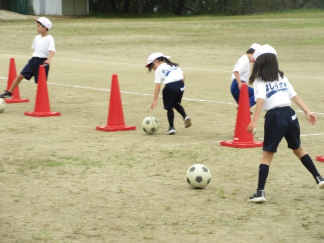 1・2年生は体育の時間に、ボールをけって運んだりしながらサッカーの練習です。ボールと仲良しになって楽しくサッカーしよう。