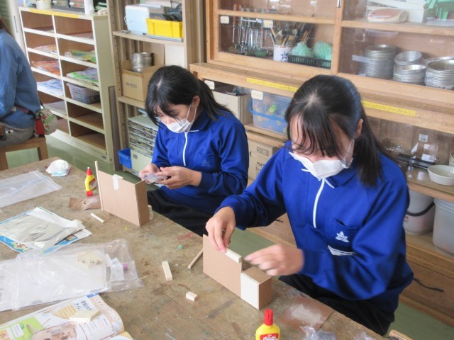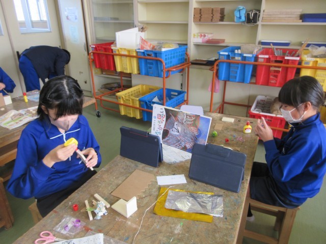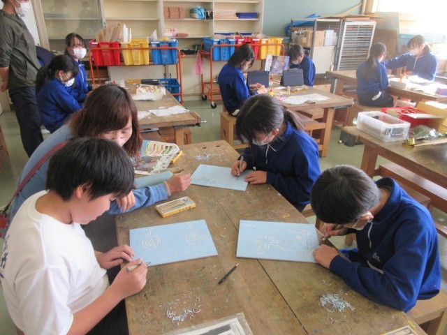 5・6年生の図画工作では、木と金属を組み合わせた木工工作や、多色刷りの木版画の彫り進めを行っています。