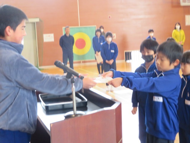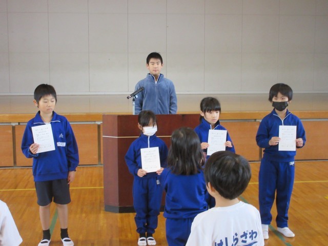 本日の全校朝の会では、学習発表会や校内持久走大会での子どもたちのがんばりを賞賛するとともに、2学期の学習のまとめに向けてがんばってほしいことなどを伝えました。また、理科作品展で受賞した児童と朝のマラソン活動でがんばった児童の表彰を行いました。