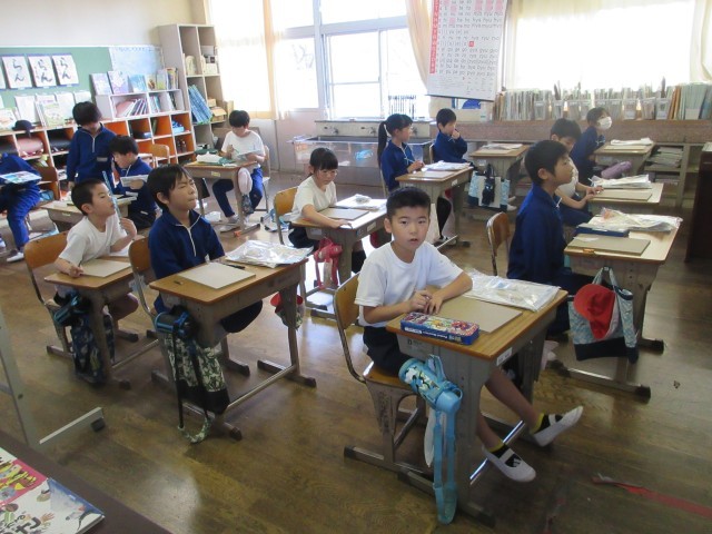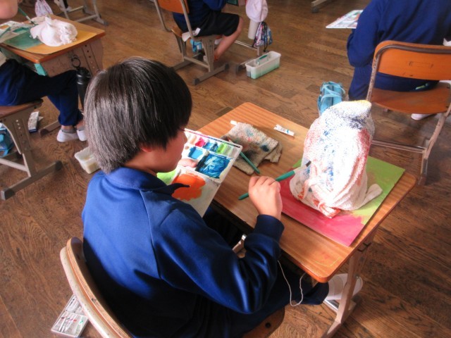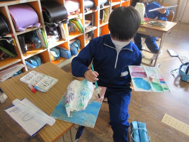 3・4年生は図画工作で、それぞれに作品作りを進めています。4年生は固めた立体に絵の具で彩色を施して作品の仕上げです。3年生は「くぎうちとんとん」の作り方を確認し、どんな作品にしようか考えていました。