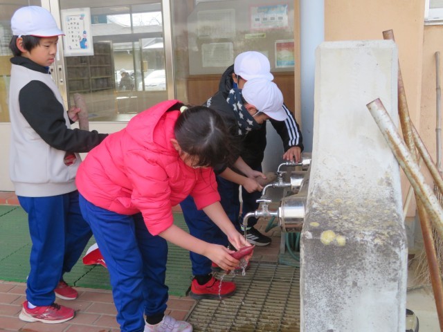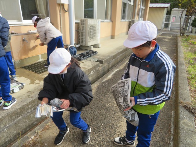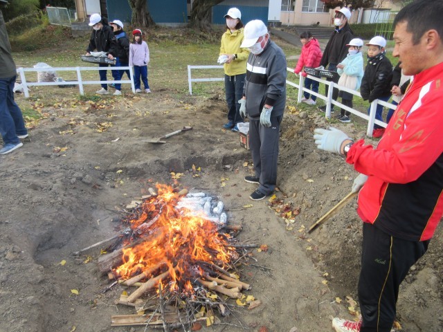 今年の学習発表会で発表した「サツマイモ物語」。今日はそのサツマイモを使って焼き芋収穫祭です。まずはきれいに洗って、新聞紙とアルミホイルにくるんで火の中に・・・。