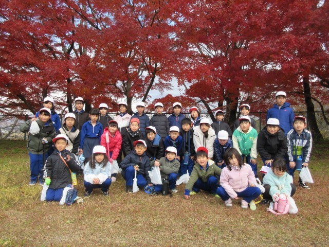 校庭の木々もきれいに色づいています。真っ赤な紅葉の下でみんなでパチリ!