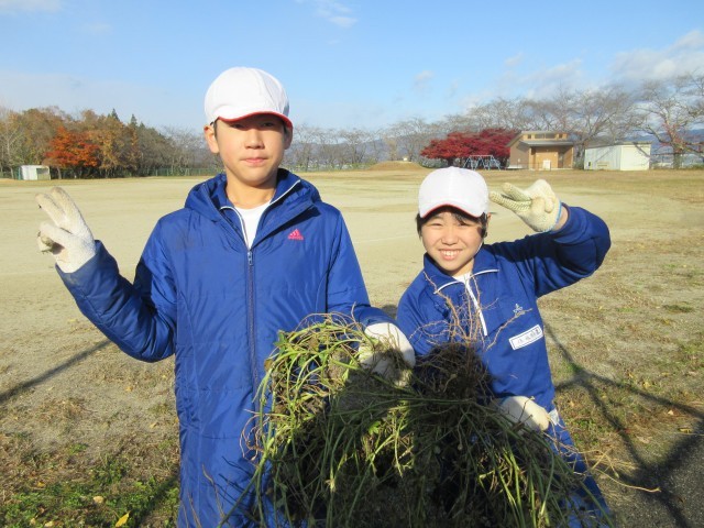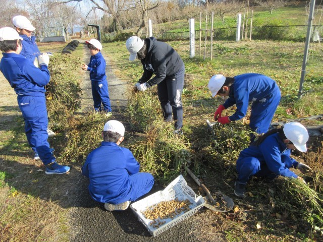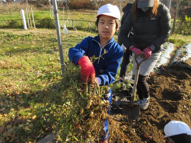 農園で育てた落花生の収穫をしました。株を引き抜いてみるとたくさんの落花生の実がついていました。茎から実のついたさやをていねいに収穫していきます。今年はどんなふうに食べようか相談しながら楽しく収穫していました。