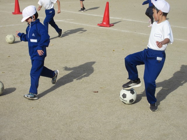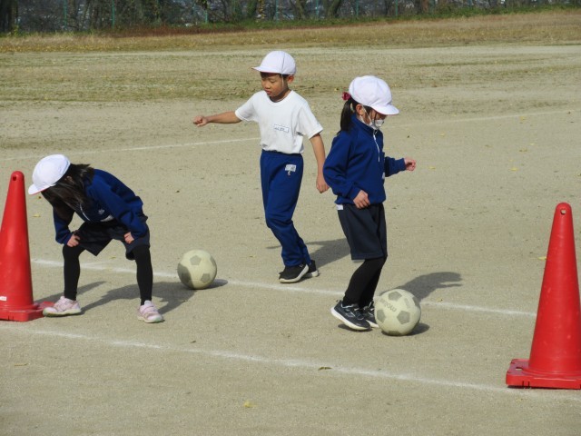 友達の足の間をとおして、うまくドリブルしながらボールを運んでみよう。思った方向に上手に運べるようにがんばろう。