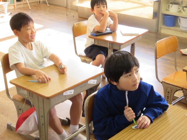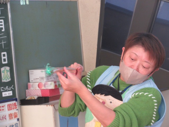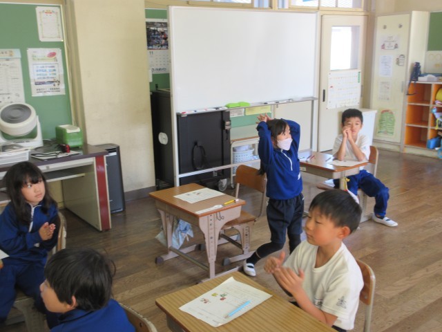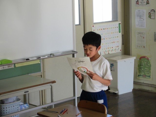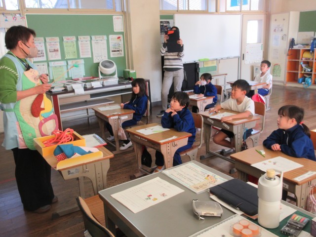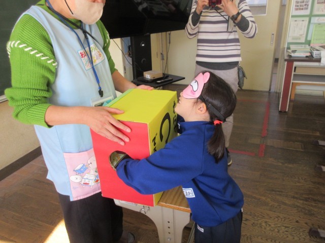 1・2年生は、「?ボックス」に入っている給食の材料を当てるクイズをしたりしながら、食材によって体の中でどんな働きをするのか学習しました。これからは好ききらいしないで給食を食べよう。