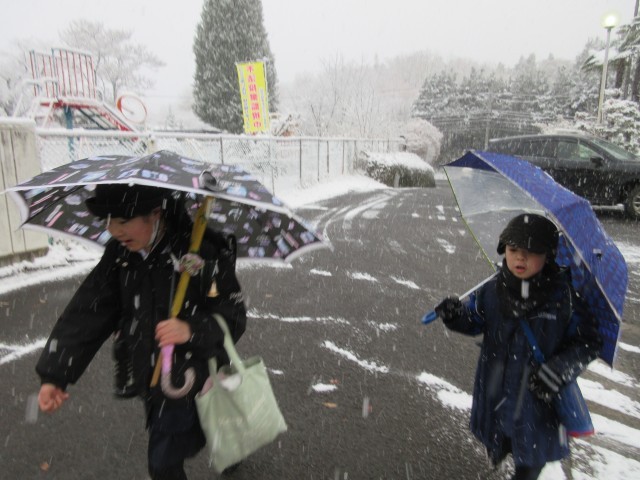 今朝は今シーズン初めての雪の朝となりました。校庭も一面真っ白で本格的な冬がやってきました。子どもたちは今から雪遊びが楽しみな様子です。