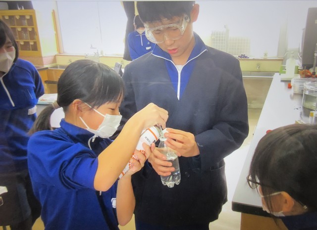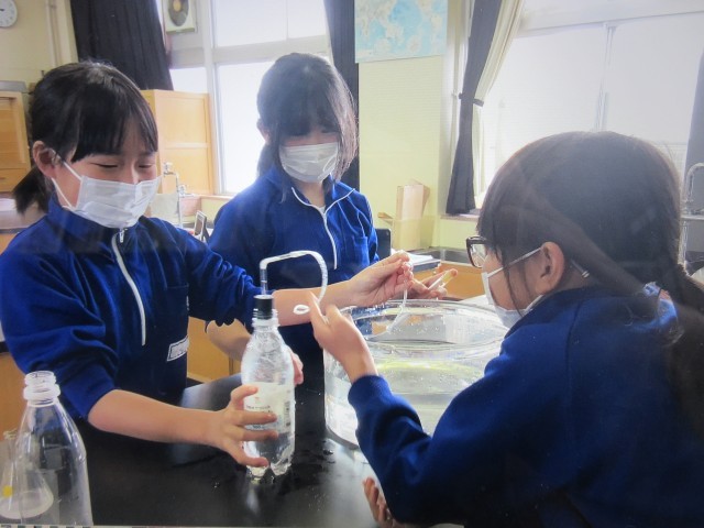 6年生は「水溶液を調べよう」の学習で、「炭酸水にとけているものは何か?」について実験で確かめました。以前に学習した二酸化炭素や酸素の性質と結びつけながら確かめることができました。