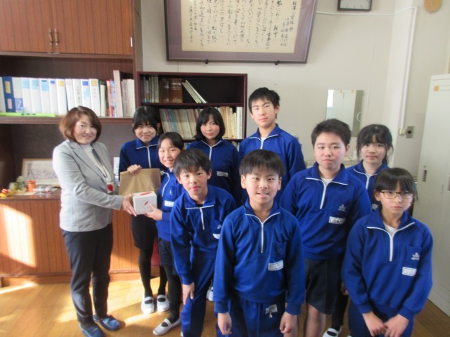 本校の代表委員会の子どもたちが呼びかけて行った赤い羽根募金を市の社会福祉協議会にお渡ししました。募金は地域の子どもたちや高齢者、障害のある方々などを支援する福祉活動や、災害支援などに役立てられます。募金にご協力いただきありがとうございました。
