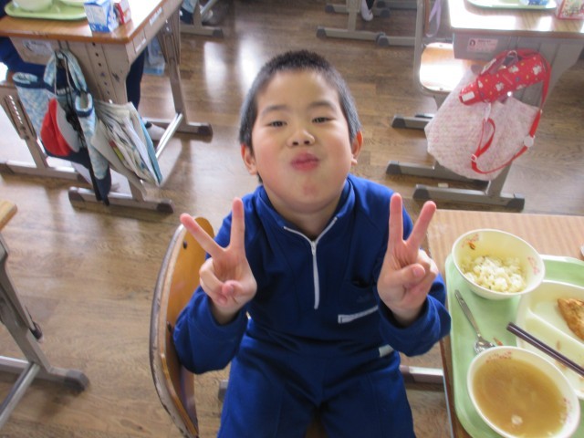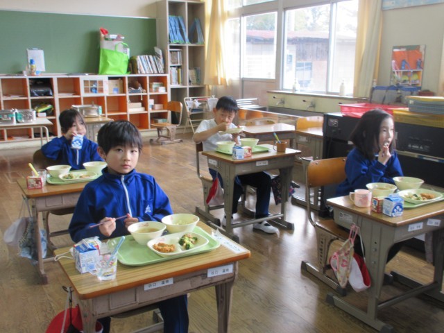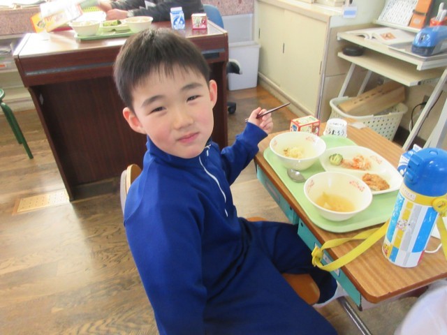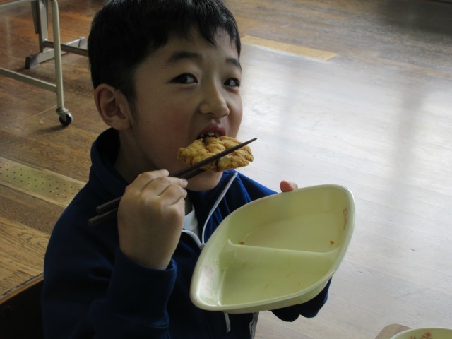 今日の給食はクリスマス献立でした。フライドチキンとケーキがついた給食に子どもたちも大喜び。スープの具材のマカロニやにんじんもクリスマスらしく星形になっていて素敵でした。