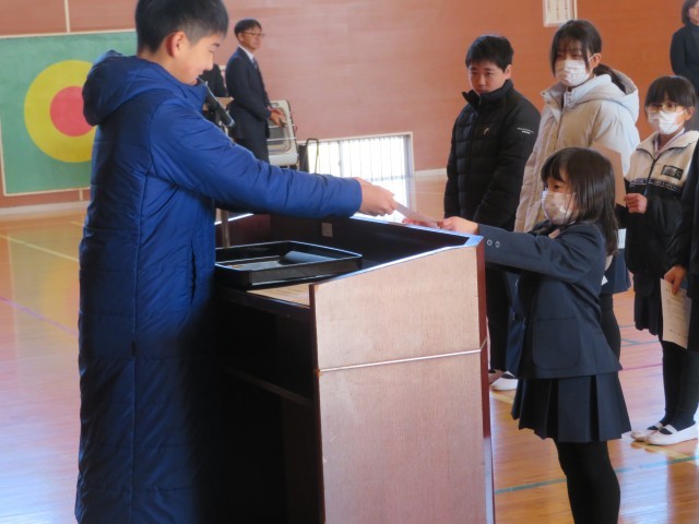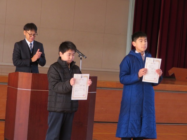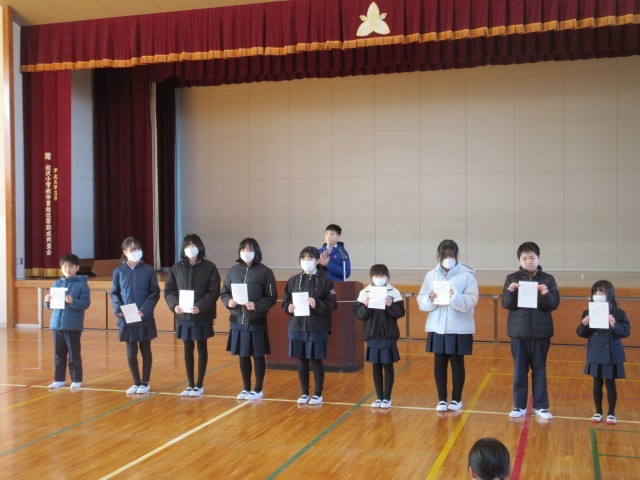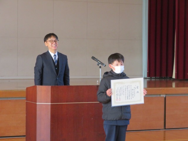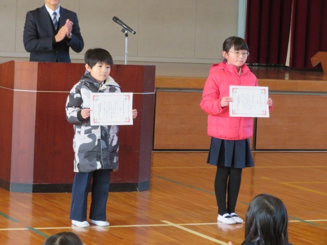 2学期には様々なコンクールなどもありました。終業式の後に、児童造形展や夢わくわく展、書道コンクールや交通安全ポスターコンクール、タイピングコンテスト、「家族のきずな」エッセイ、水道五七五コンテストなどの表彰、また朝のマラソン活動をがんばった児童の表彰などを行いました。本当にたくさんの頑張りを見ることができた2学期でした。