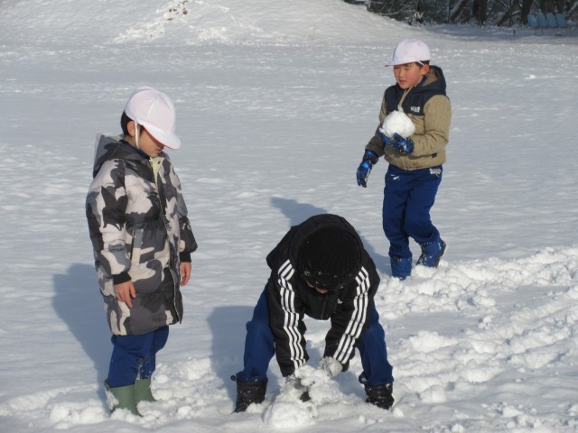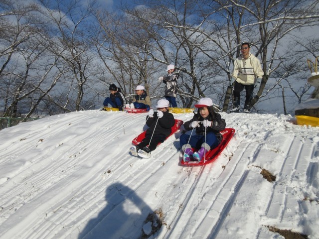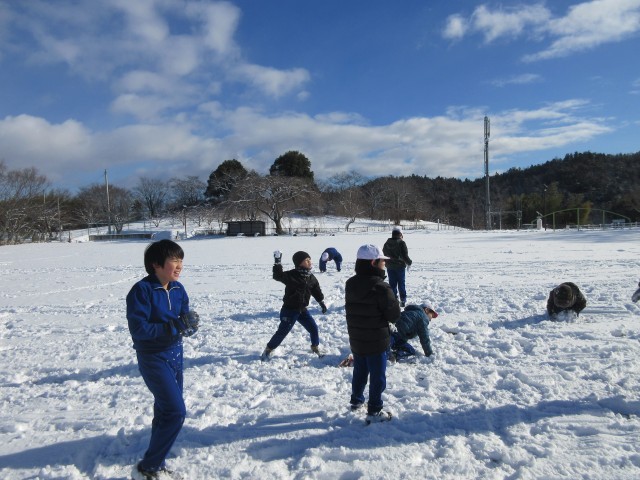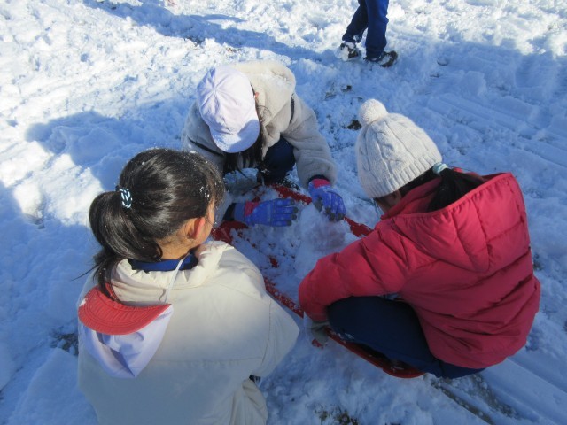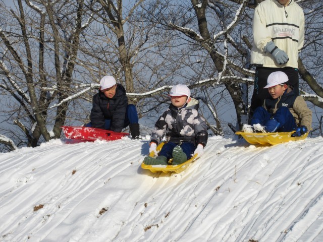今朝降った雪で校庭は一面の銀世界。子どもたちは大喜びで築山でそり遊びを楽しんでいました。今年の冬休みはあまり雪遊びの機会がなかったので、友達と一緒に元気に雪遊びをしていました。