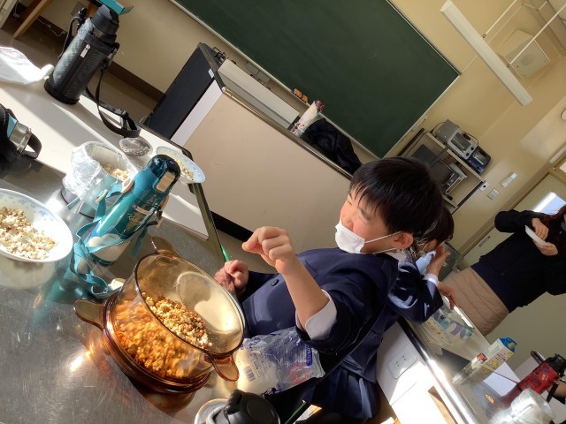 のびすくのみんなでポップコーンづくりをしました。うまくポップコーンがはじけるように火加減を調節して、絶妙な塩加減になるように塩のふりかけにもこだわって(?)ポップコーンを調理しました。格別のお味にみんなにっこにこでした。