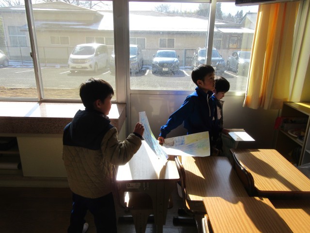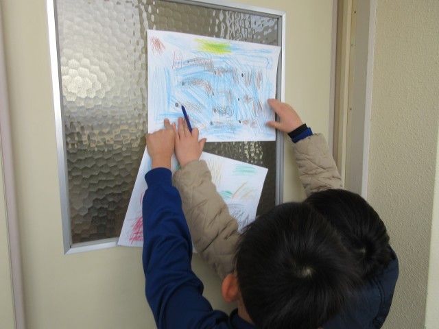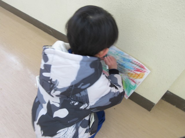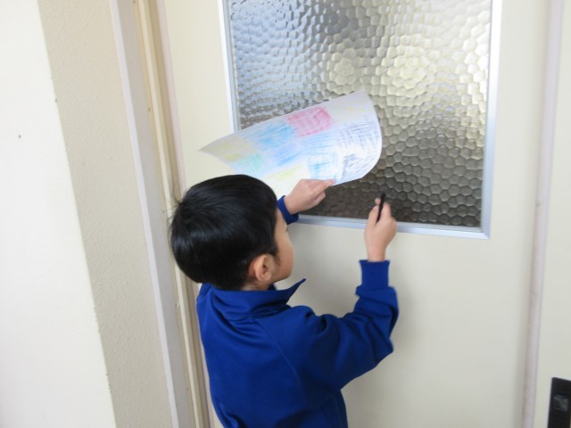 「でこぼこはないかな?」1・2年生が校舎内を探して歩いていました。でこぼこの形を紙に写しとって楽しい作品に仕上げていました。