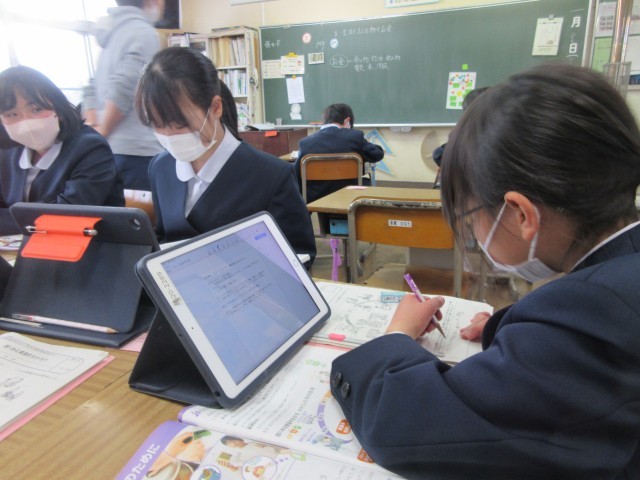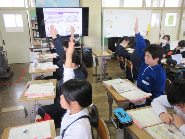 5年生は家庭科の学習で「生活を支えるものやお金」の学習で、生活の中でどんなことにお金が使われているか振り返りながら学習を進めていました。6年生は、「持続可能な社会の実現」に向けて、身近な生活の中で無駄な消費を避け、身の回りの物を大切にする5R(リユース、リデュース、リサイクル、リヒューズ、リペア)について話し合っていました。