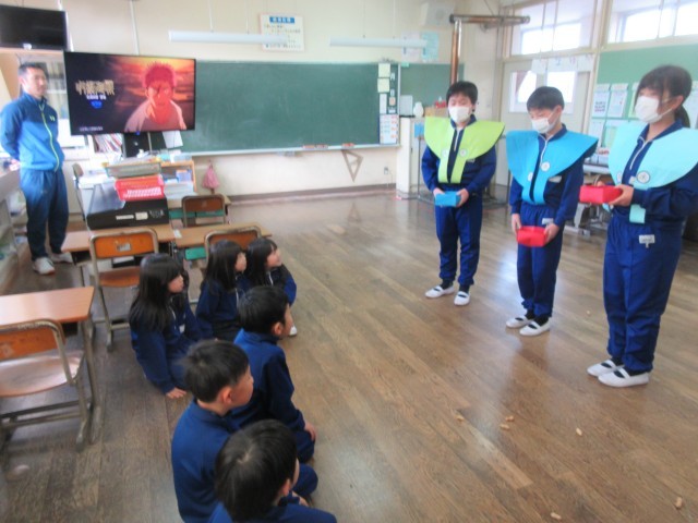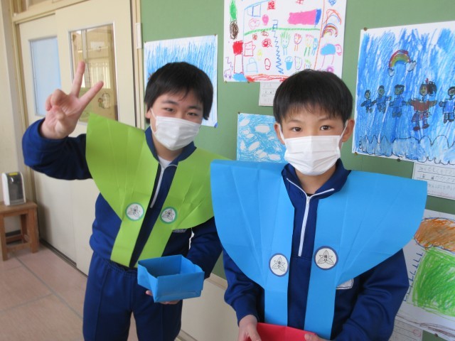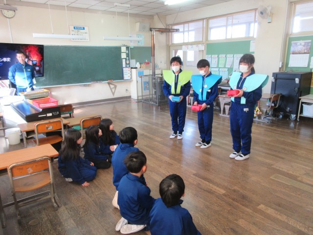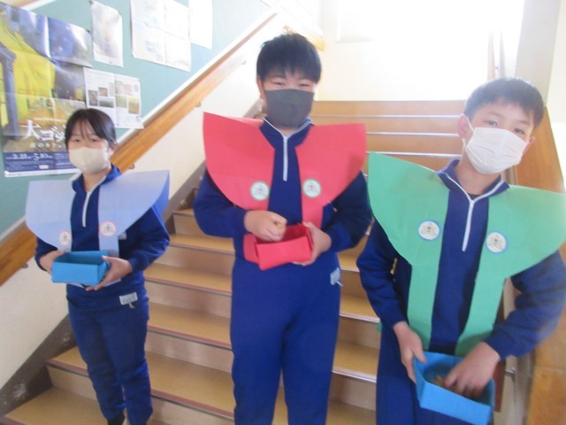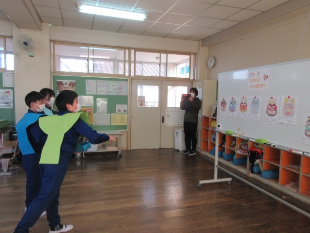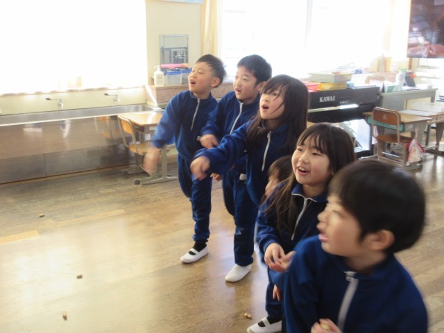 午年生まれの年男・年女の5年生が、豆のまき手になって各教室を回って節分集会を行いました。各教室では、自分の追い出したい鬼をめがけて、元気に豆をまいて「なまけんぼう鬼」や「わすれんぼうの鬼」などの心の鬼を退治しました。準備を進めてくれた5年生の皆さんありがとう。