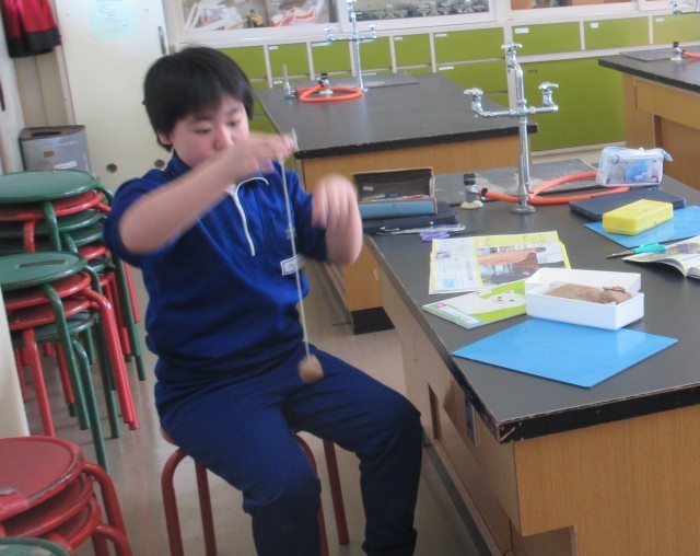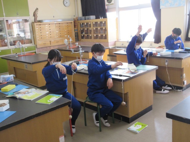 「ふりこの長さを変えると揺れ方が変わるかな。」5年生は、理科室でふりこを揺らしながら、「ふりこのきまり」について調べる学習の計画を話し合っていました。