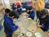 1年生は、発泡スチロールの容器を使って動くおもちゃ作りを行いました。乗り物に色をぬったり、切りこみを入れたりしながら作る様子は真剣そのものです。出来上がりが楽しみですね。