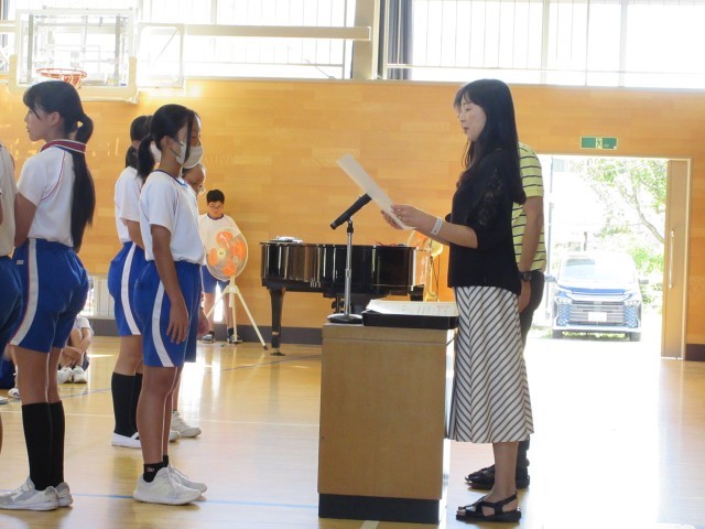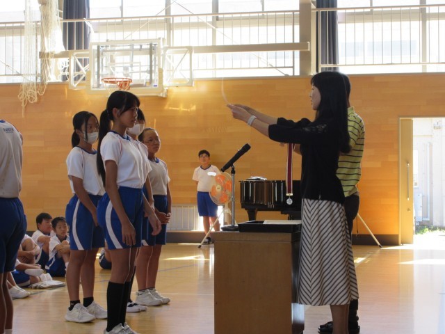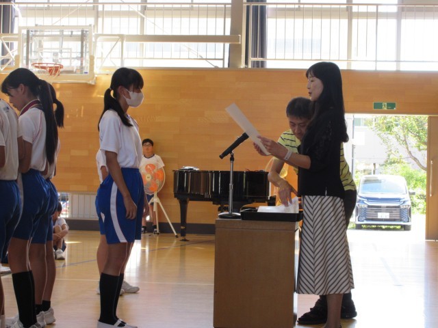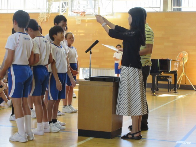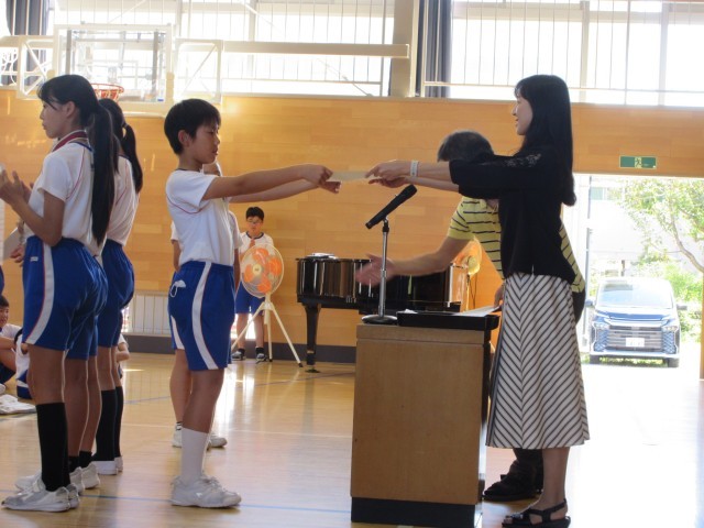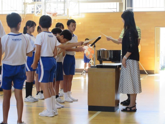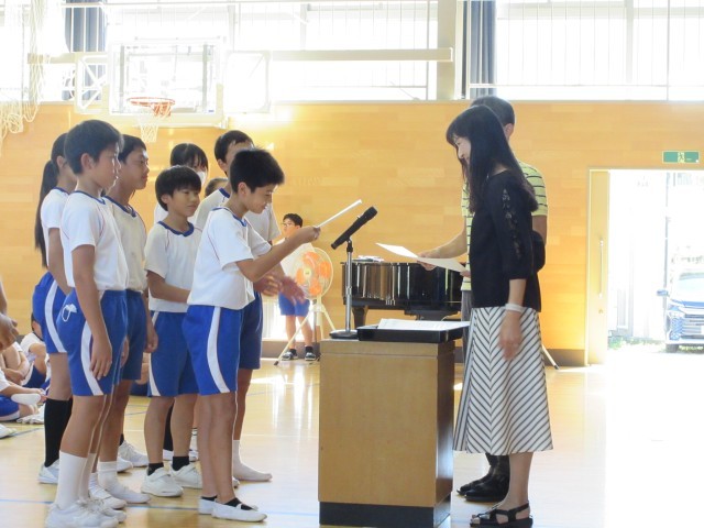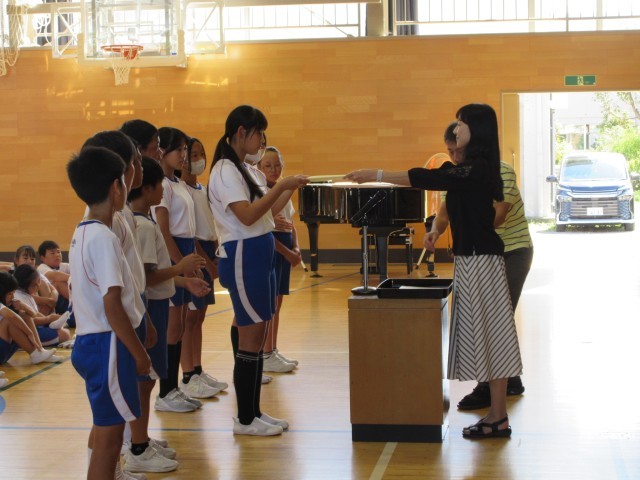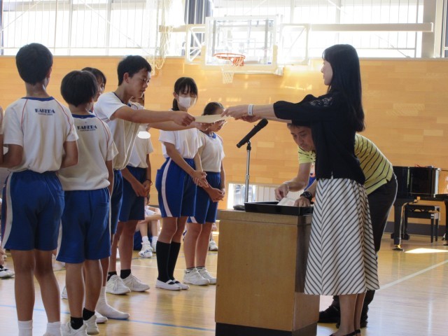 きらきらタイムで、吹奏楽と陸上記録会の表彰がありました。