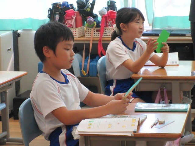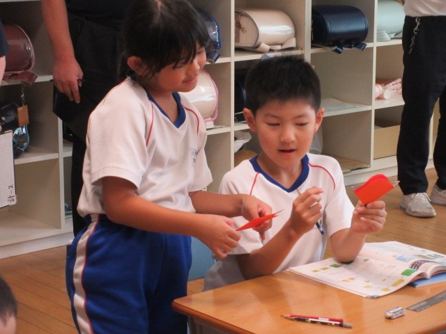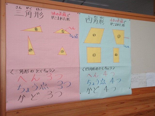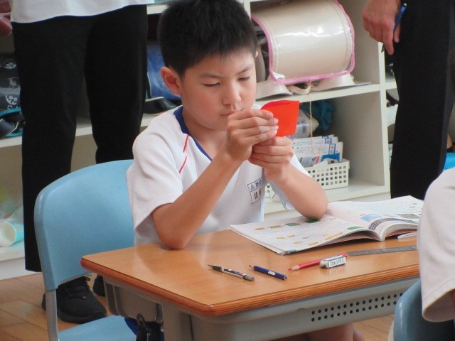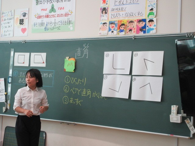 「直角」について初めて学習した2年生は、身の回りのかどの形について調べました。