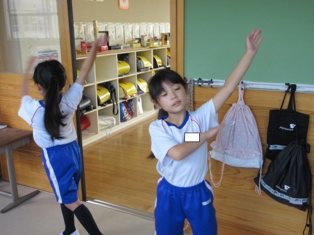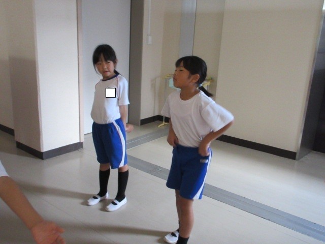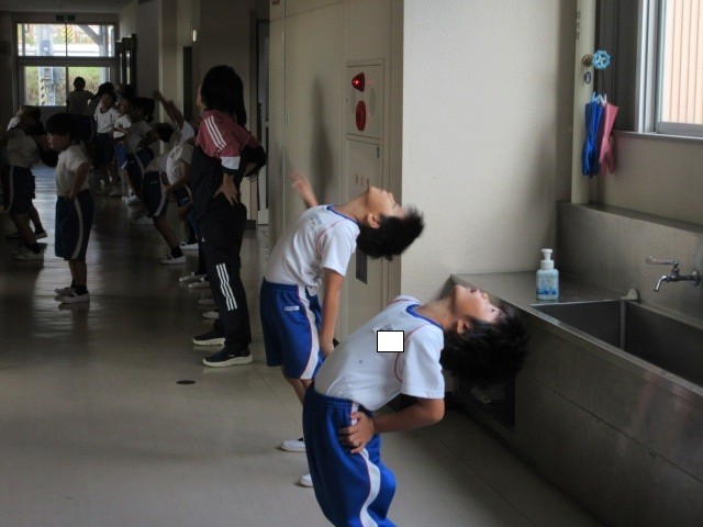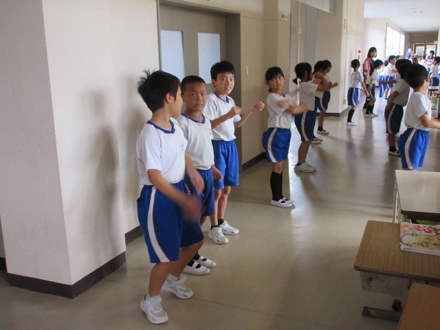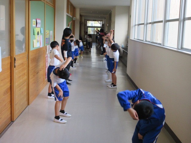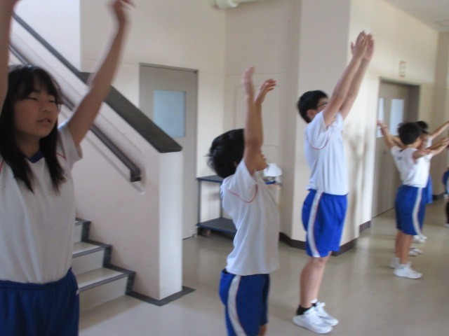 今日の体力アップタイムは、校庭の状態がよくなかったので、校舎内でラジオ体操をしました。