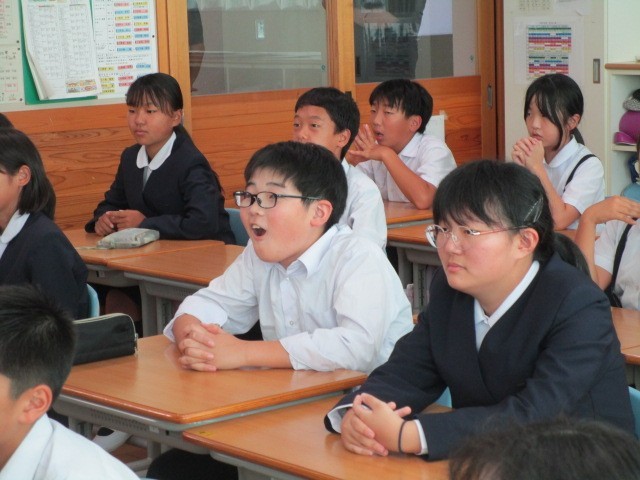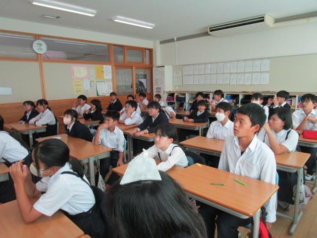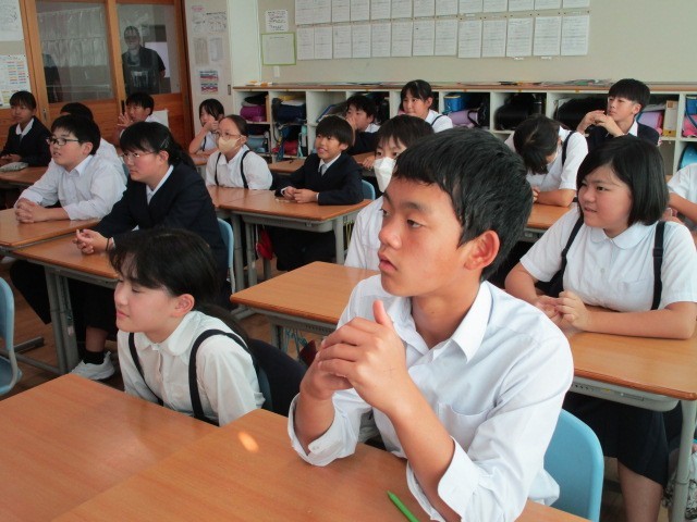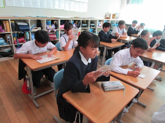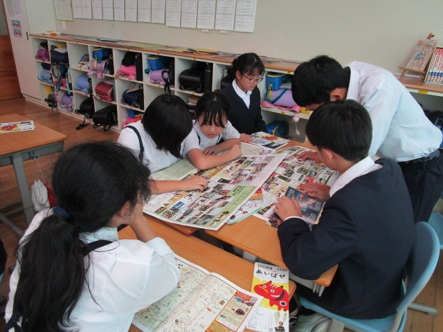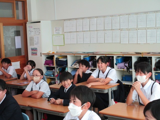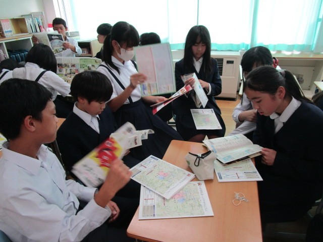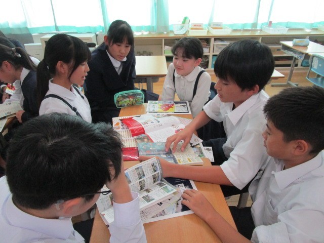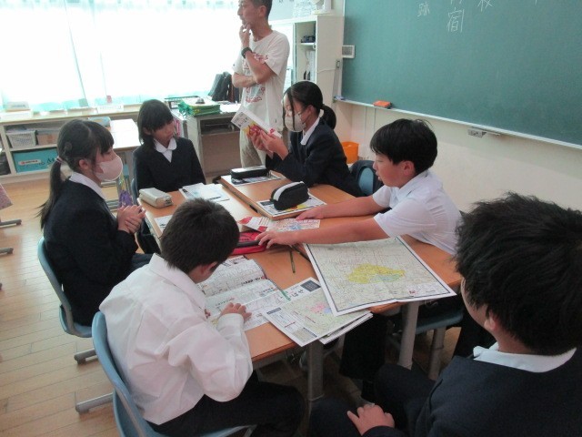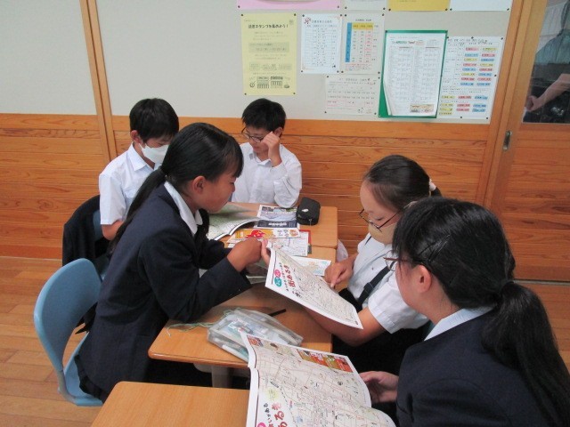 6年生の学活です。修学旅行に向けての話がありました。修学旅行の目的や2日間の行程について話を聞き、その後パンフレットをもとにフィールドワークで行う工芸体験をグループで考えました。