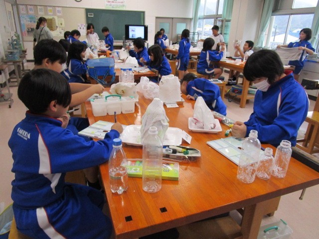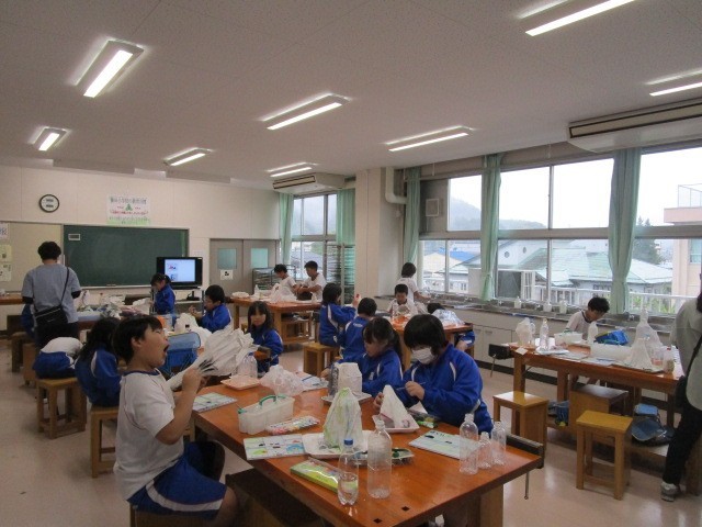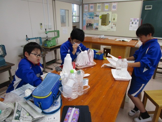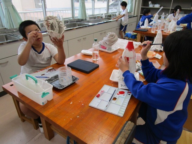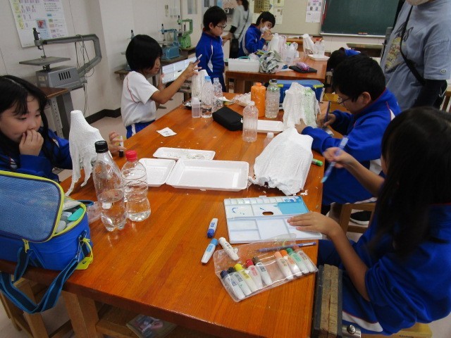 4年生の図工です。「どろどろカッチン」の学習を行いました。液体粘土で固めた布に色をつけました。