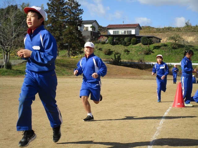 高学年の持久走記録会の様子です。5分間、自分のペースで走りきりました。