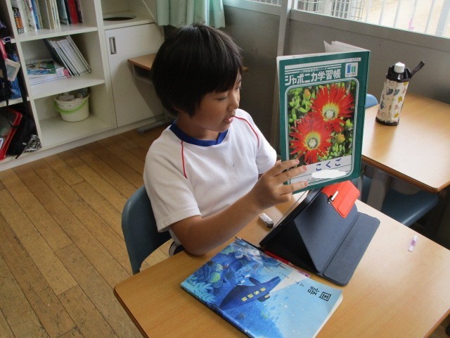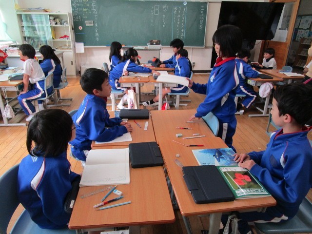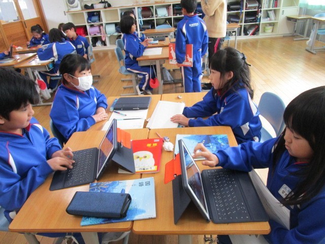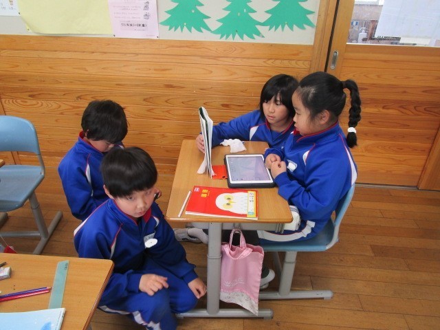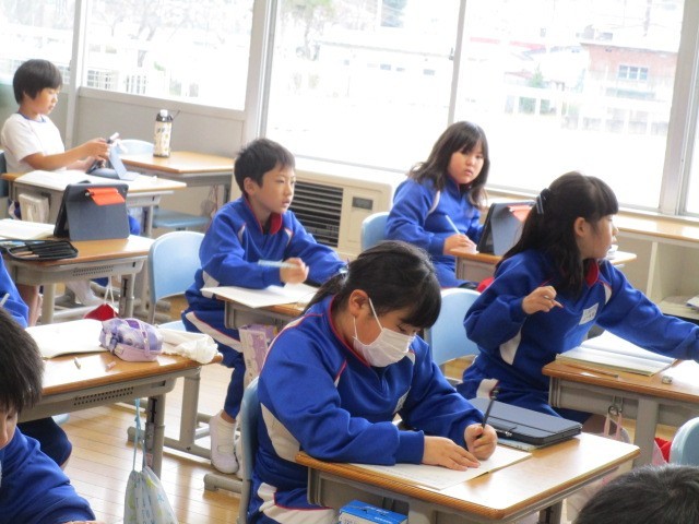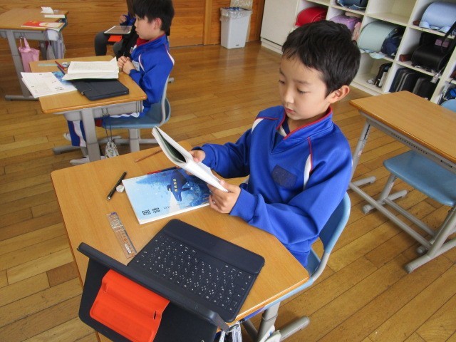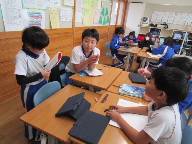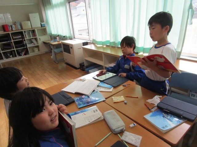 3年生の国語です。「すがたをかえる大豆」の単元で、すがたをかえる食品について調べたことを発表しました。相手に分かりやすく伝えるために練習をしてから友達に紹介しました。