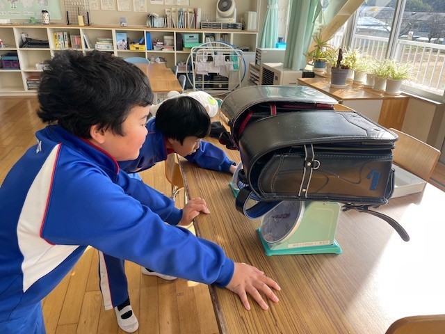 くわのみ1組の算数科の学習です。今日は、はかりを使って教室の中にあるものの重さをはかってみました。目盛りの読み方を確認し、いろいろなものの重さをはかることができました。