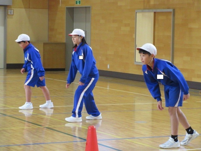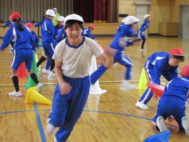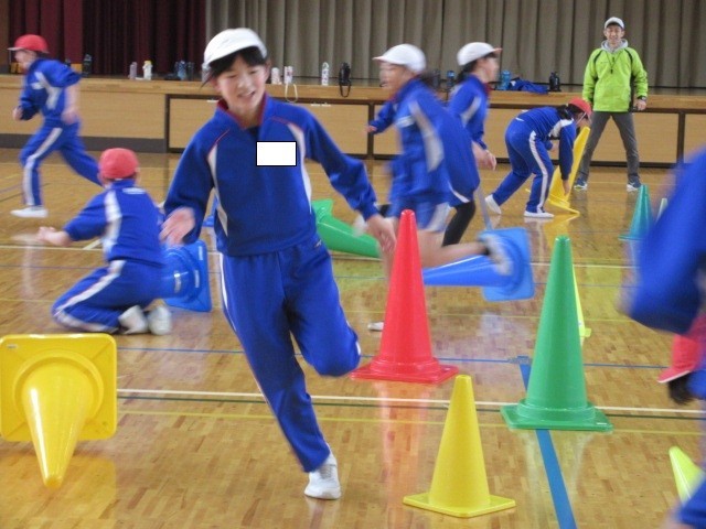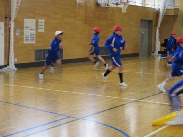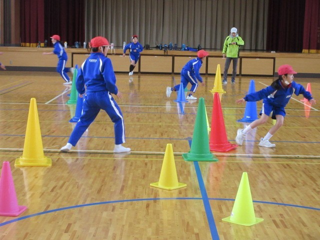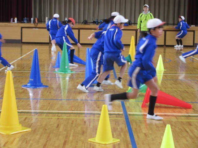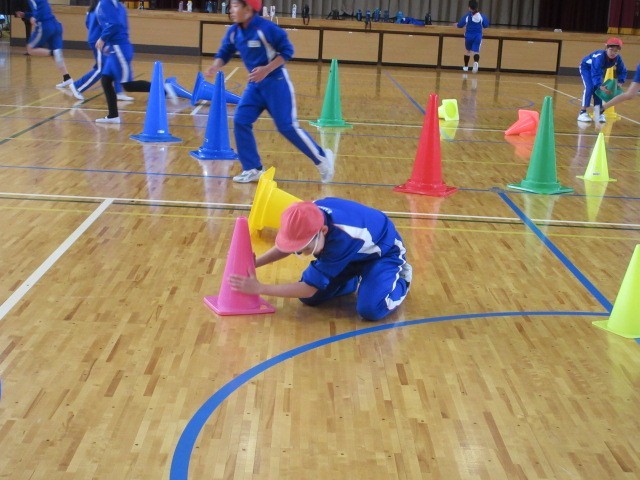 2チームに分かれて、コーンを倒したり、立てたりします。