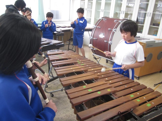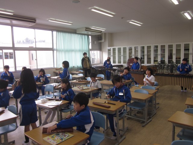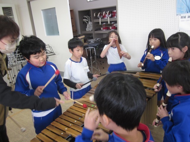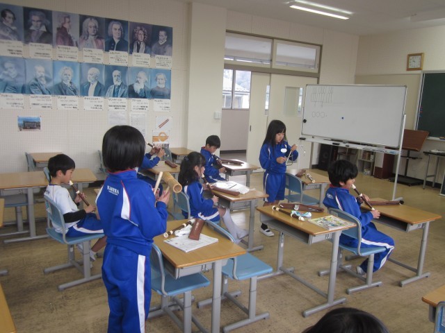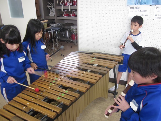 3年生の音楽です。「ちんちろりん」を木琴とリコーダーで演奏しました。最後はウッドブロックとトライアングルも使って合奏しました。